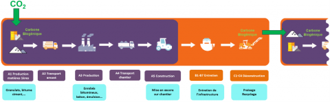Il faut également noter que, lorsque la règle conventionnelle de réémission en fin de vie du carbone biogénique est appliquée conformément à la norme, le résultat de l’indicateur Changement climatique – Total est équivalent à celui d’un enrobé bitumineux classique qui ne contiendrait pas de composants biosourcés.
