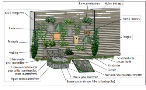 Sur 7 km de l’autoroute A480 dans l’agglomération de Grenoble, l’entreprise d’ingénierie a ainsi proposé un renforcement de la continuité longitudinale le long du Drac en s’appuyant sur les structures du projet. Ainsi, la végétalisation des murs acoustiques et de soutènement côté Drac vise à favoriser la biodiversité et renforcer la continuité écologique le long du cours d’eau (photo 3). Les plantes doivent également concurrencer les espèces exotiques envahissantes et être une source de nourriture pour les oiseaux et les insectes. Vis-à-vis de la faune, les murs sont aménagés de manière à offrir des espaces de repos, de nidification ou d’hibernation pour différentes espèces et favoriser le retour d’une faune plus diversifiée dans un contexte de proximité d’urbanisation.